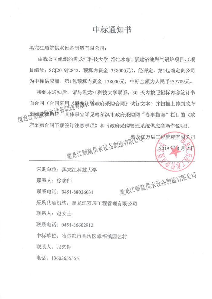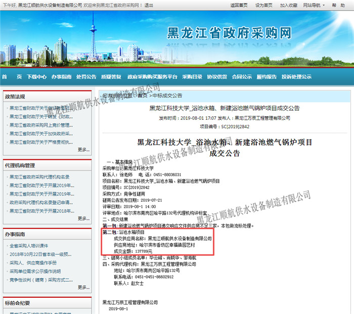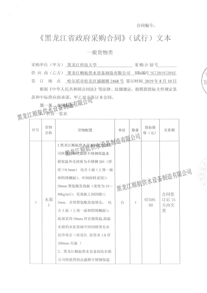 黑龙江科技大学浴池水箱采购 已全部完成合同工作内容并经验收交付使用 |